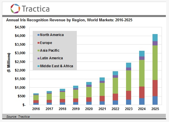 Tractica:2025年全球虹膜识别市场将增长至41亿美元 199IT原创编译 受到消费者和政府应用增长的推动,2025年全球虹膜识别设备出货量将从2016年的1070万部增长至6160万部。 长久以来,虹膜识别一直受制于科技研究。2005年开始虹膜识别技术开始走向消费市场,超过10家大型虹膜识别硬件制造商以及各种软件研发企业推动虹膜识别技术的应用。 根据Tractica的预测,2025年全球虹膜识别市场收入将从2016年的6.766亿美元增长至41亿美元。 199IT.com原创编译自:Tractica 非授权请勿转载 更多阅读:Tractica:2025年全球生物识别市场收入将达到151亿美元Tractica:预计2022年移动AR月活跃用户数量达到19亿Tractica:预计2022年全球联网可穿戴贴片市场达到79亿美元Tractica:2017年全球智能耳机销量560万部Tractica:2016年全球智能服装出货量在170万件左右Tractica:2016年全球消费机器人销售额达38亿美元Tractica:2022年全球智能AR眼镜市场规模将达到197亿美元Tractica:预计2025年全球深度学习芯片市场将达到122亿美元Tractica:2021年全球企业VR市场规模将达到92亿美元Tractica:预计2021年移动VR市场规模将达到109亿美元Tractica:2022年全球企业机器人市场将达到679亿美元Tractica:2021年全球仓储和物流机器人市场将达到224亿美元Tractica:2025年全球商业无人机收入将达到126亿美元Tractica:2025年全球医疗保健AI市场将达到193亿美元Tractica:预计2025年全球人工智能收入将增长至598亿美元