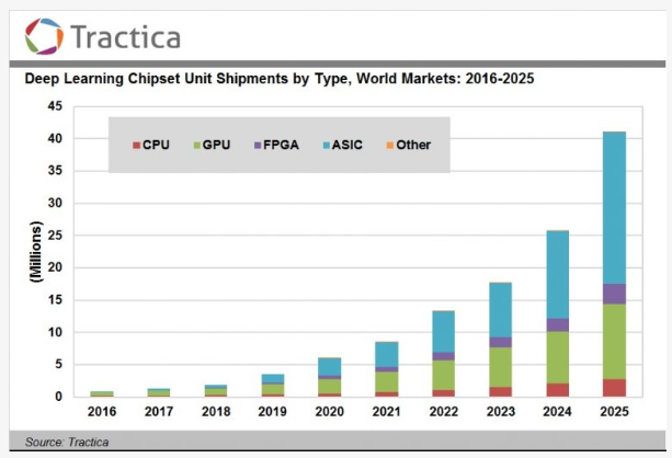 Tractica:预计2025年全球深度学习芯片市场将达到122亿美元 199IT原创编译 CPU、GPU、FPGA、ASIC和其他新型芯片将成为深度学习不断发展的主要动力。 根据Tractica的预测,2025年深度学习芯片出货量将从2016年的86.3万个增长至4120万。同时,深度学习芯片收入将从2016年的5.13亿美元增长至122亿美元,复合年增长率42.2%。 199IT.com原创编译自:Tractica 非授权请勿转载 更多阅读:Tractica:2025年全球深度学习软件市场将达到672亿美元Tractica:2025年全球计算机视觉市场将达到262亿美元Tractica:2018年企业人工智能市场将达到236亿美元Tractica:2025年全球人工智能软件收入达到888亿美元Tractica:2025年全球医疗保健AI市场将达到193亿美元Tractica:预计2025年全球人工智能收入将增长至598亿美元Tractica:2017年全球情绪分析软件收入1.23亿美元Tractica:2025全球企业高性能计算市场将达到315亿美元Tractica:自然语言处理在17个行业已经有44个独立用例Tractica:2025年汽车AI市场规模将达到265亿美元Tractica:2025年全球人工智能市场将达到368亿美元斯坦福大学:2019年人工智能指数报告表面繁荣之下,人工智能的发展已陷入困境人工智能、机器学习、深度学习三者之间的同心圆关系Tractica:2018年全球AI软件市场价值为81亿美元