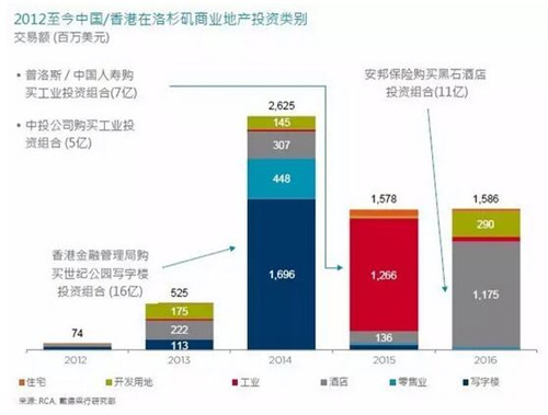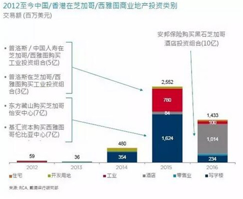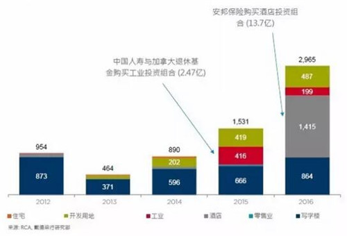 写字楼和酒店仍然最受中国投资者青睐,工业地产投资则大幅放缓。 酒店投资在2016年为86亿美元,而2015年仅为28亿美元。