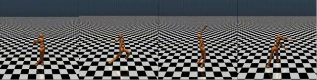 在两个强化学习基准上我们对比了进化策略和强化学习的表现:MuJoCo 控制任务和 Atari 游戏。每个 MuJoCo 任务(看以下示例)包含一个模拟身体的铰接式人物,策略网络获得所有关节的位置信息,需要输出每个关节的力矩(torques)从而前行。以下是在三个 MuJoCo 控制任务上训练的代理示例,任务目标是前行。