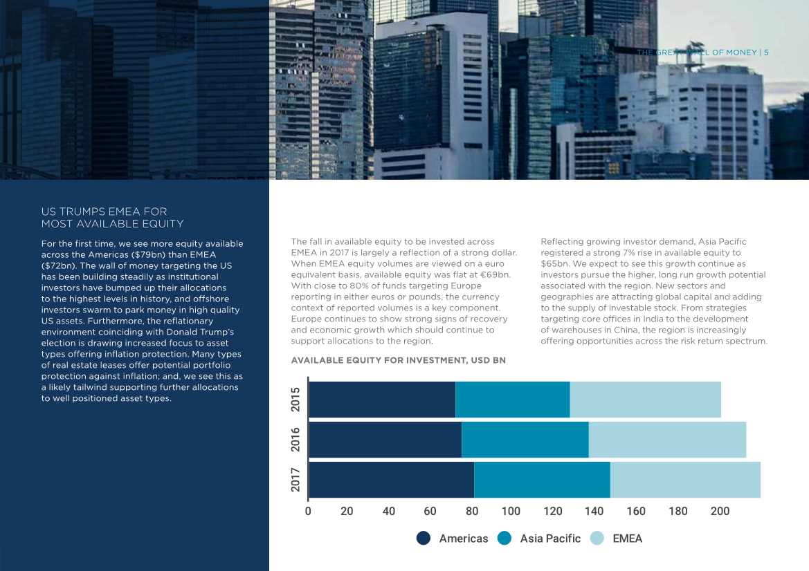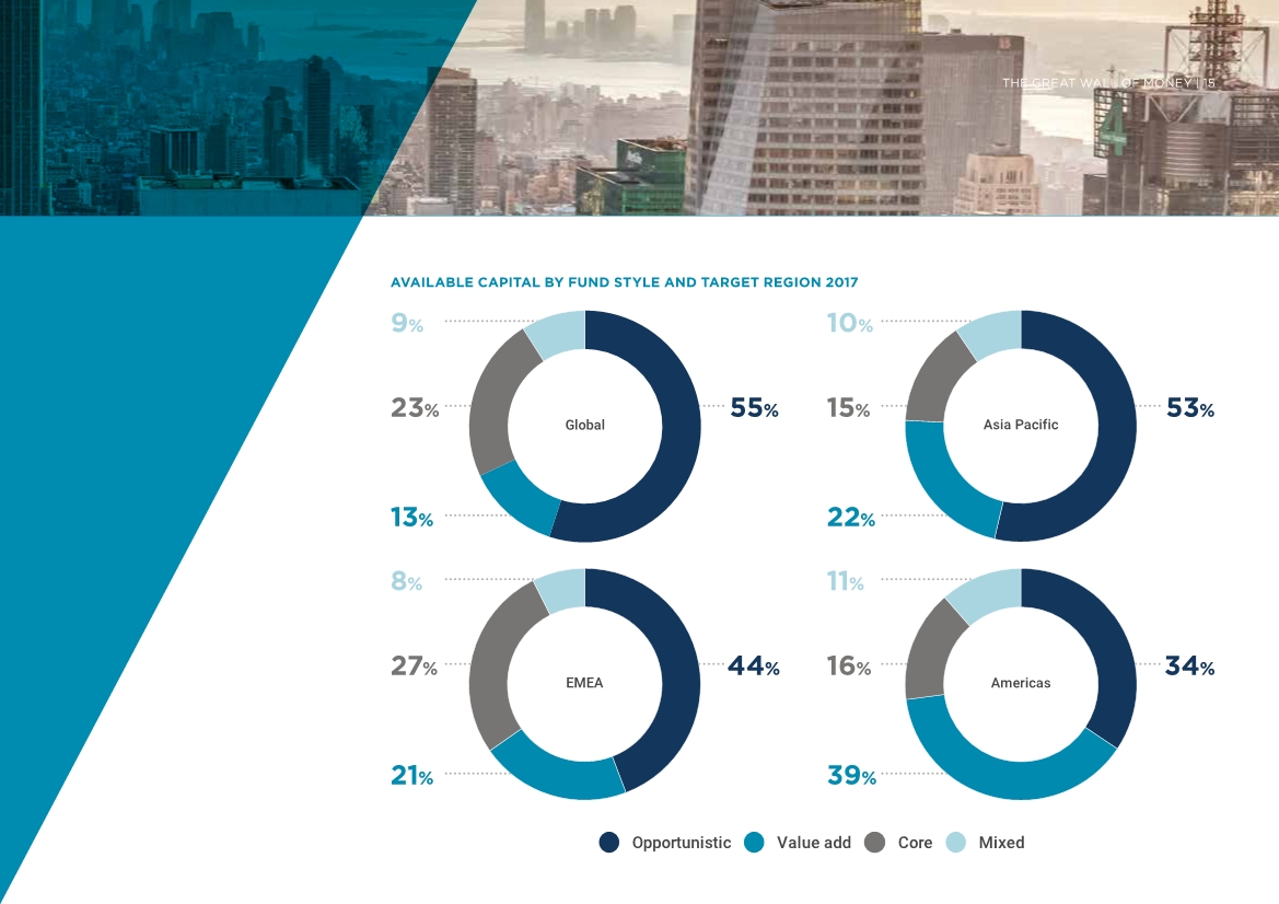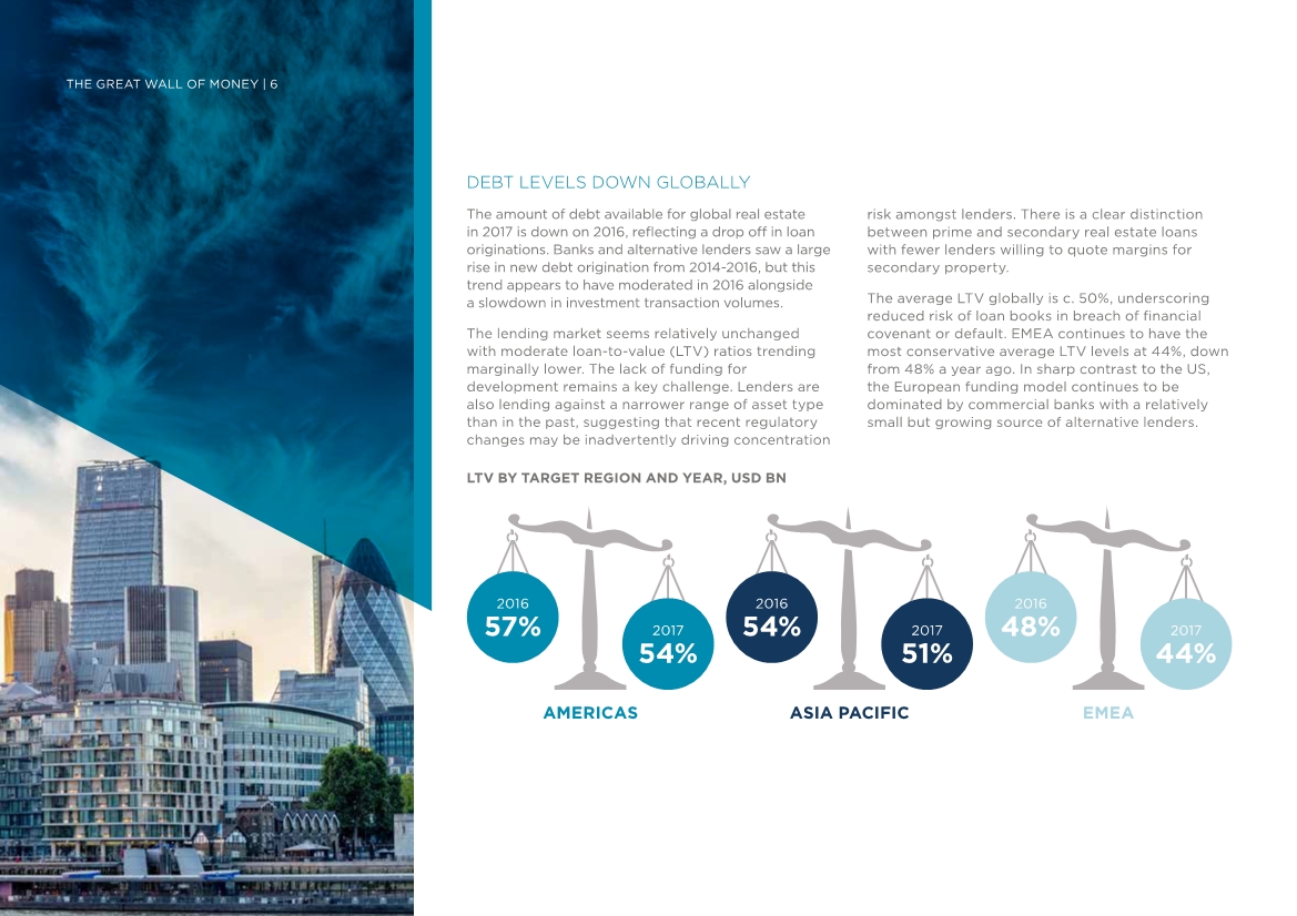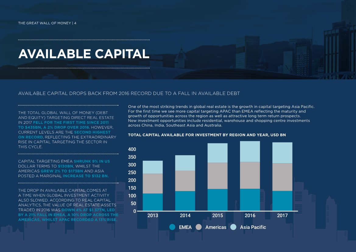 最新的”The Great Wall of Money“报告显示,2017年房地产业资金壁垒(债务和股权)首次呈现下降趋势。自2011年房地产业债务和股权达到4350亿美元后,2017年房地产业资金壁垒将比2016年下降2%,主要是由于现有债务水平下降。