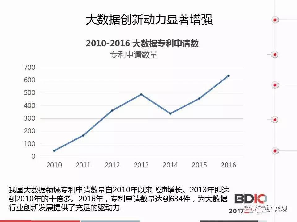 •我国大数据领域专利申请数量自2010年以来飞速增长。2013年即达到2010年的十倍多。2016年,专利申请数量达到634件。