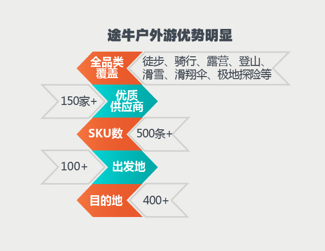 截至目前,途牛已完成户外游产品全品类覆盖,包括徒步、骑行、露营、登山、滑雪、滑翔伞、极地探险等,合作优质供应商超过150家,产品总数达500余条,产品覆盖国内外400个目的地,涉及100多个出发地,可以满足各级别户外爱好者的多样化需求。