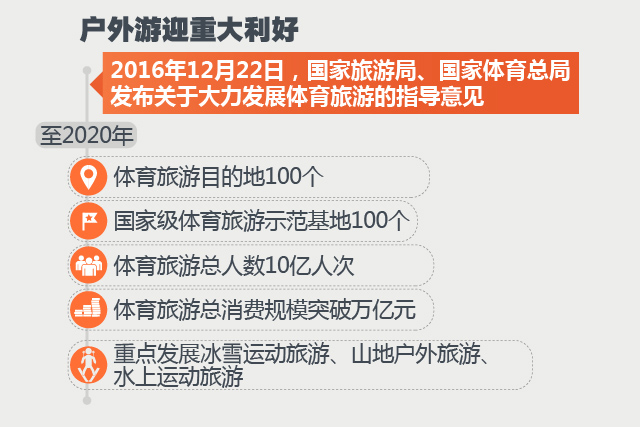 2016年12月22日,国家旅游局、国家体育总局发布关于大力发展体育旅游的指导意见,提出到2020年建成100个具有重要影响力的体育旅游目的地、100个国家级体育旅游示范基地,体育旅游总人数达到10亿人次,体育旅游总消费规模突破万亿元,将重点发展冰雪运动旅游、山地户外旅游、水上运动旅游等新产品和新业态。这对于户外旅游而言形成了重大利好。
