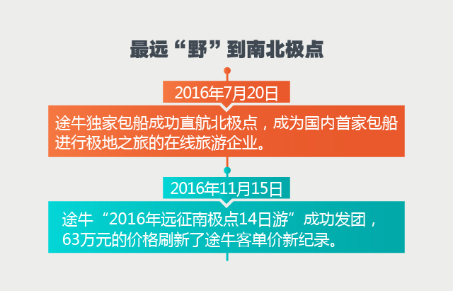 2016年7月20日,近120名中国探险者乘坐核动力破冰船——“50年胜利号”前往北极点。北极点包船项目的成功,带动了途牛南极点、南极圈、北极圈一系列极地旅游产品的升温。2016年11月15日,途牛“2016年远征南极点14日游”产品发团,63万元的价格刷新了途牛客单价纪录。