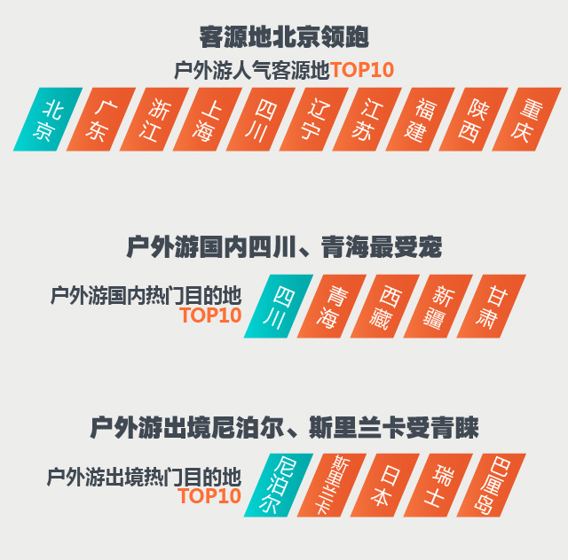 户外游客户主要来自哪里?报告显示,户外游客源地前十名分别为北京、广东、浙江、上海、四川、辽宁、江苏、福建、陕西、重庆。客源地多集中在经济较发达的区域。