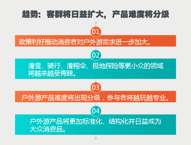 此外,随着互联网、移动互联网的高速发展,户外游产品将更加标准化、结构化,也更容易获取,逐渐打破熟人经济、小圈子的局限,最终成为人人触手可及的标准化、体验式旅游产品,并日益成为大众消费品。