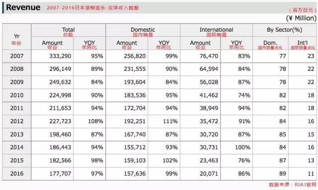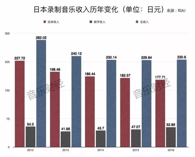 日本2016年的录制音乐总收入为2305.93亿日元(20.9亿美元),较2015年全年的2296.39亿日元(20.8亿美元)增加了0.42%。其中一直走低的实体收入(不包含音乐录影带)比2015年下降了2.7%,为1777亿日元(16亿美元),占总收入的77.1%;而528.9亿日元(4.79亿美金)的数字收入则比2015年增长了12.3%,持续的涨势勉强弥补了实体收入下降对总收入带来的影响。
