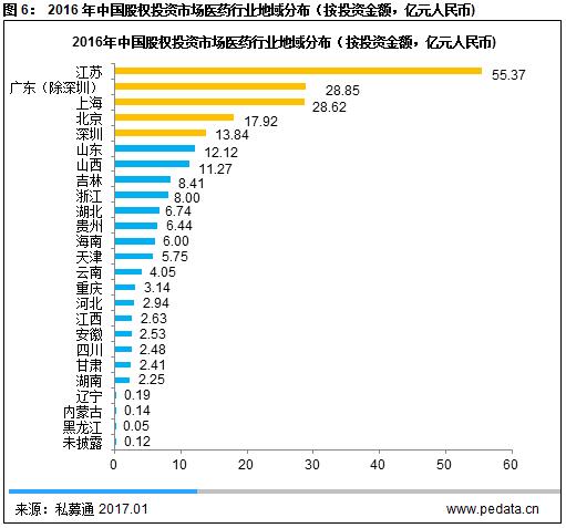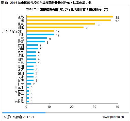 从投资地域看,2016年江苏省医药企业获得投资最多,共发生38起投资案例,占比17.4%,投资金额高达55.37亿元人民币,占比23.8%;其次是上海,共发生37笔投资案例,投资金额是28.62亿元人民币。
