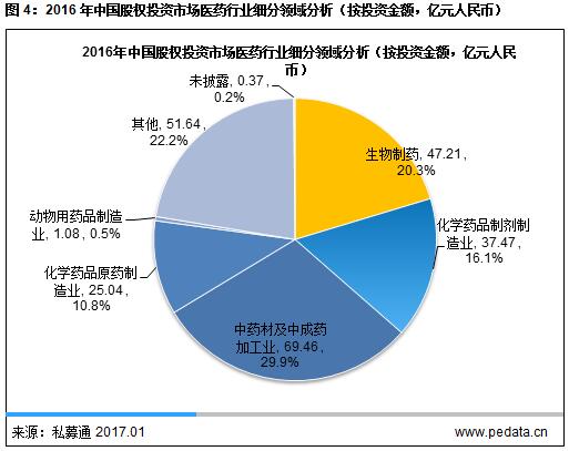2016年医药行业细分领域投资中,生物制药占比最高,投资案例数有64起,占比29.2%;投资金额47.21亿元人民币,占比20.3%;由于生物技术的发展,抗体偶联技术的成熟,CRO公司的发展,大大缩短了生物制药的研发周期,生物制药高速发展。其次是化学药品制剂制造业,投资案例数和投资金额占比分别是25.1%和16.1%。