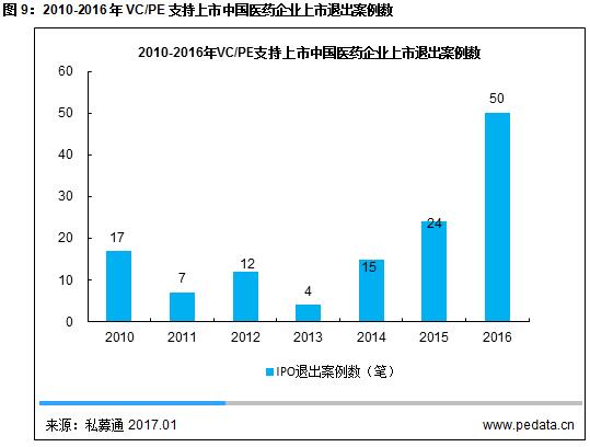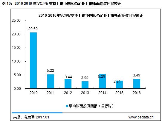 根据清科集团旗下私募通统计显示,2010-2016年期间,中国医药企业共发生129笔IPO退出,其中2016年退出案例数最多,有50笔之多,在此期间,中国医药企业IPO平均账面回报倍数是6.23。由于2010年创业板开闸,大量医药企业登陆创业板,该年投资回报倍数也最高,达到20.60倍。