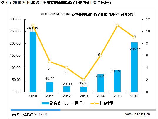 根据清科集团旗下私募通统计显示,2010-2016年期间,中国医药企业共有95家上市,融资金额高达1,227.86亿元,同时超过一半的医药上市企业背后均有VC/PE支持。2010年世界经济稳定复苏,IPO创业板开闸,大量药企成功上市,因此该年上市医药企业最多,有25家医药企业在海内外上市。