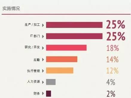 研究显示:79%的绝大多数受访者认为工业4.0对于自己所在的企业很重要,这一部分人中的56%甚至计划短期内投资构建相关的组件。许多企业认为安全是工业4.0实施过程中的严峻挑战(图1),但是研究也发现,只有12%的受访者认为工业4.0对于自己所在企业的管理层而言既是挑战同时也是机遇,通常情况下负责实施工业4.0的主要是生产和IT部门(图2)。