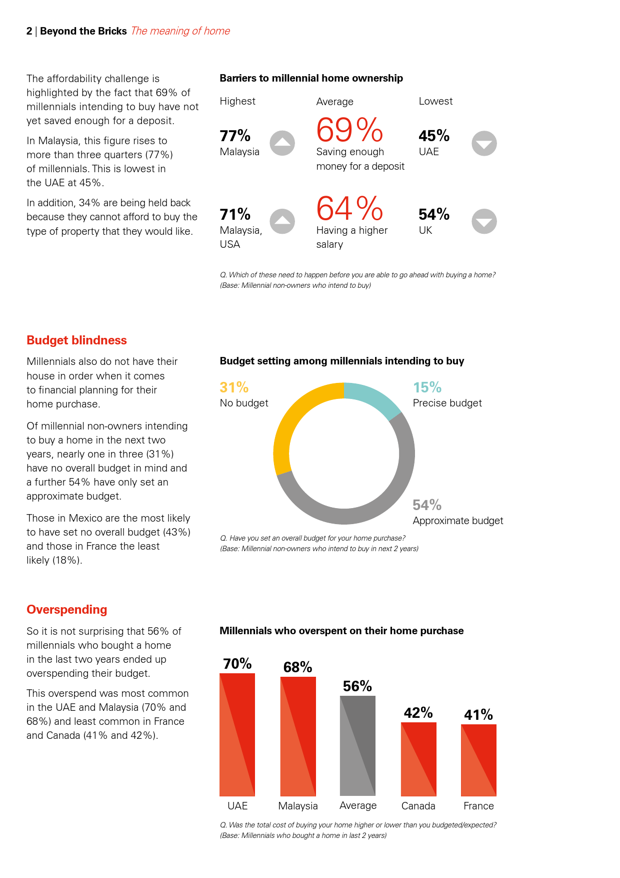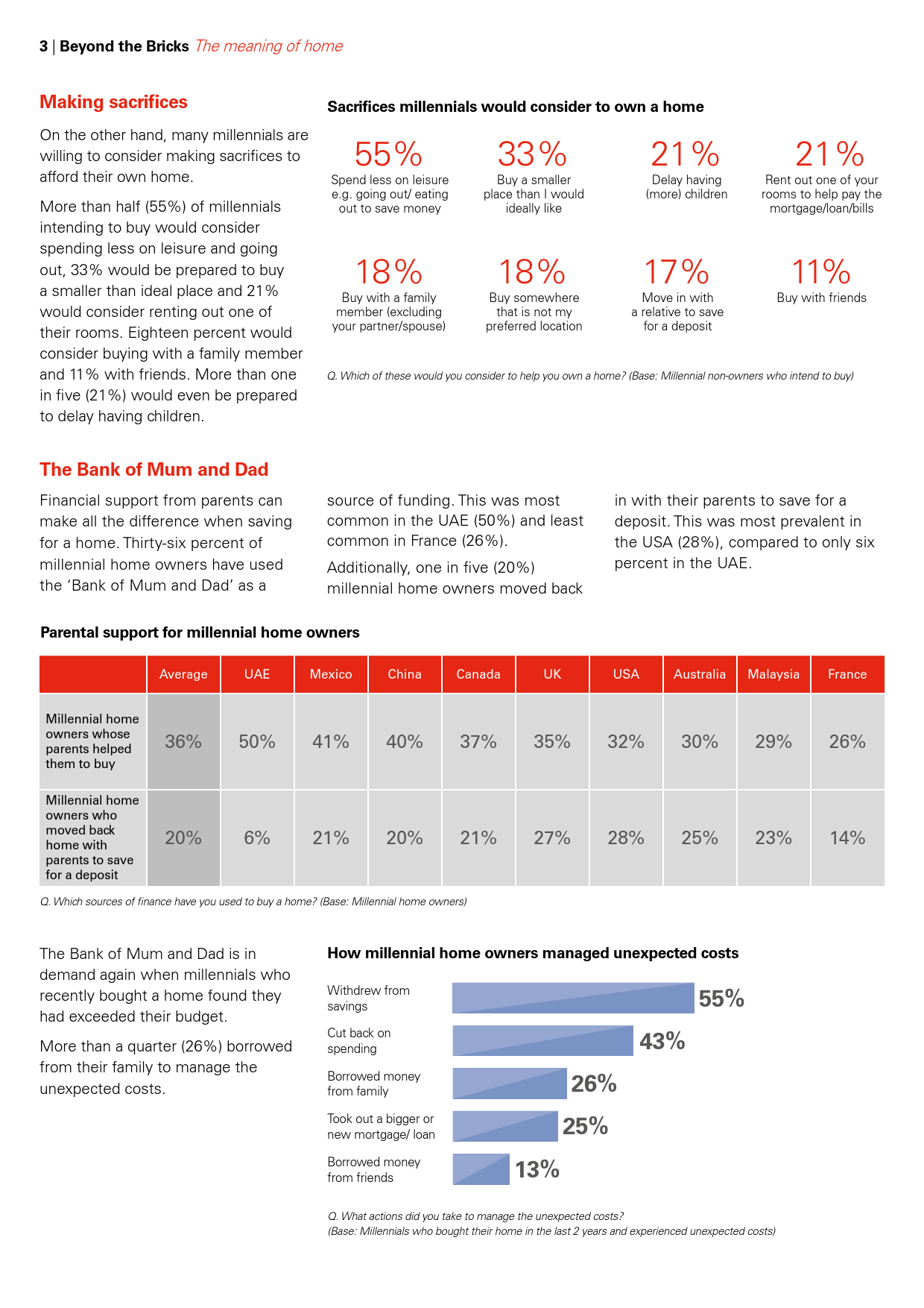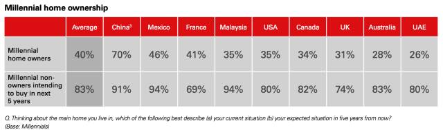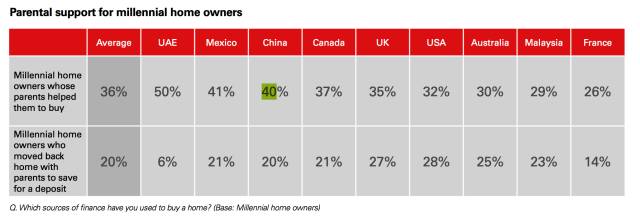 因为房价高企,很多年轻人在购房时不得不寻求父母帮助,超过三分之一(37%)的接受调查的千禧一代表示,他们的父母资助了住房费用。在阿联酋,50%的千禧一代在购房时获得了父母资助,在九个国家中名列第一,墨西哥为41%,中国40%,加拿大37%,英国35%,美国32%,澳大利亚30%,马来西亚29%,法国26%。