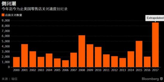 瑞信集团分析师克里斯蒂安·布斯表示,今年迄今的店铺关闭速度已经超过了2008年同期,也就是美国上一次经济衰退肆虐的时候。他在一份报告中说,今年迄今宣布的店铺关闭数量大约2,880间,2016年同期为1,153间。