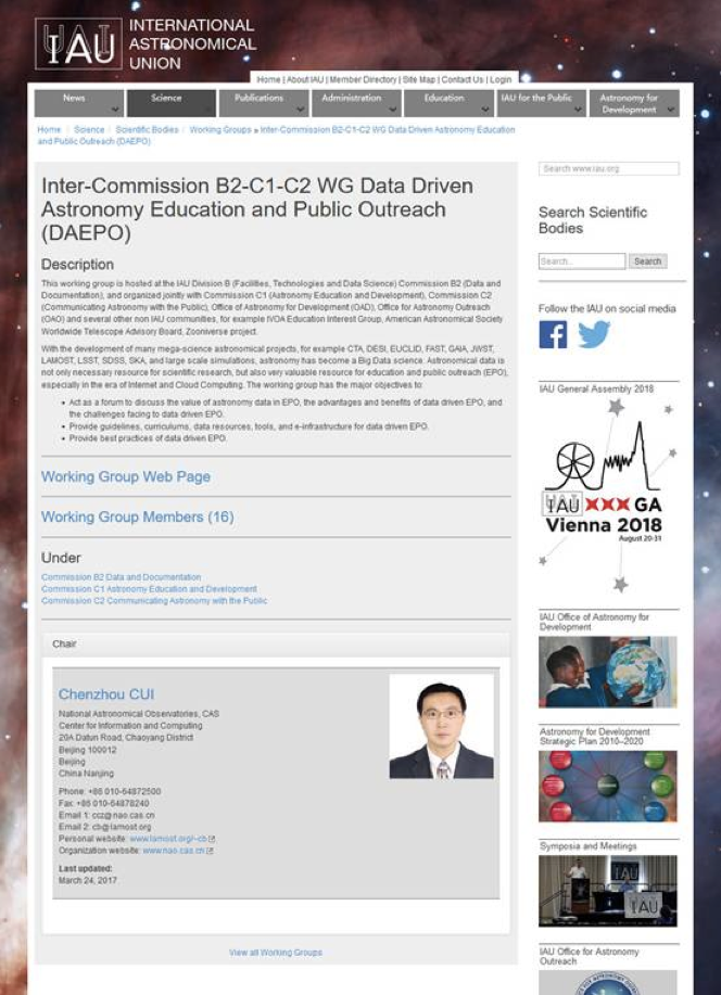 国际天文学联合会(IAU)于1919年7月在比利时成立,来自95个国家和地区的11000 多名天文学家参与其中,中国天文学会于1935年加入。“数据驱动的天文科普教育”工作组创始成员有16人,包括来自全球各地的多位天文学巨匠。