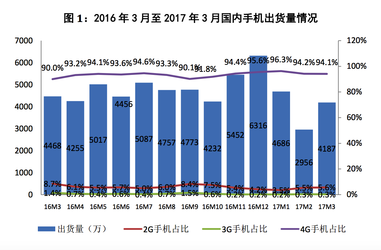 据来自中国信通院数据显示,2017年3月,国内手机市场出货量4187.1万部,同比下降6.3%;上市新机型128款,同比下降31.2%。1-3月,国内手机市场出货量1.18亿部,上市新机型225款,同比分别增长1.7%和下降31.4%。(注图片1、2均来自中国信通院)