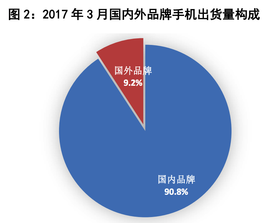 2017年3月,国产品牌手机出货量3802.2万部,同比下降2.1%,占同期国内手机出货量的90.8%;上市新机型123款,同比下降30.1%,占同期国内手机上市新机型数量的96.1%。1-3月,国产品牌手机出货量1.05亿部,同比增长4.3%,占同期国内手机出货量的88.8%;上市新机型213款,同比下降30.8%,占同期国内手机上市新机型数量的94.7%。