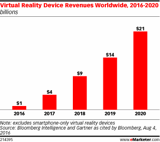 Bloomberg Intelligence和Gartner预计,今年PC端VR设备收入将达到40亿美元,到2020年将增长至210亿美元。