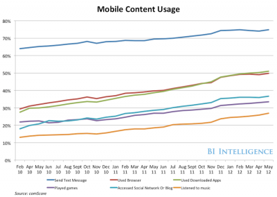 音乐:智能手机同时身兼MP3的角色,comScore调研得出美国市场用手机听音乐的用户数量从2009年9月的12%上升至2012年5月的27%。