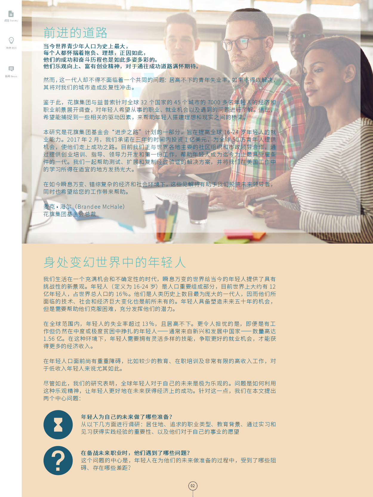 本研究是花旗集团基金会“进步之路”计划的一部分,旨在提高全球16-24 岁年轻人的就业能力。2017 年2 月,我们承诺在三年的时间内投资1 亿美元,为全球50 万青年人提供机会,使他们走上成功之路。目前我们正与世界各地主要的社区组织和市政领导合作,通过提供创业培训、指导、领导力开发和第一份工作,帮助年轻人成为迄今为止最具受雇条件的一代。