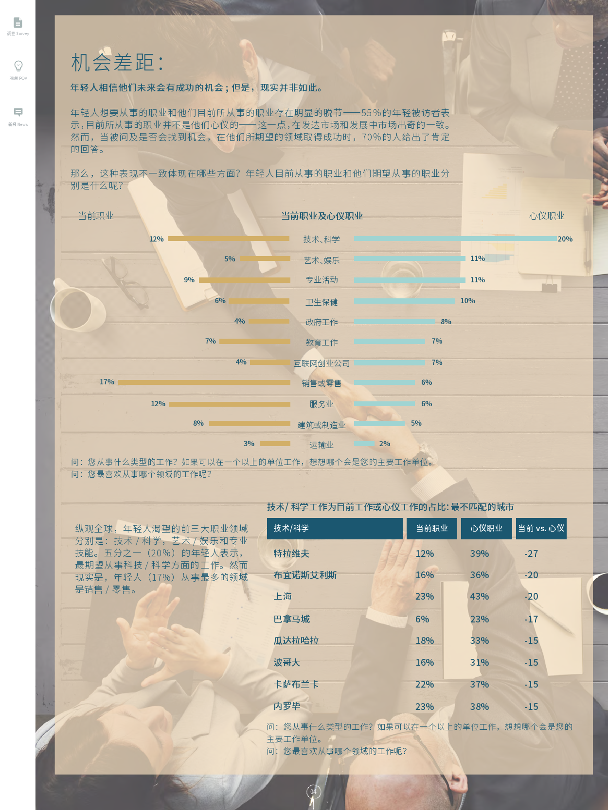 当今世界青年人口为史上最大,他们的成功和奋斗历程也是如此多姿多彩的。然而,这一代人却不得不面临着一个共同的问题:居高不下的青年失业率。如果不得以解决,其将对我们的城市造成反复性冲击。鉴于此,花旗集团与益普索展开调查。借此,希望能捕捉到一些相关的驱动因素,来帮助年轻人搭建理想和现实之间的桥梁。