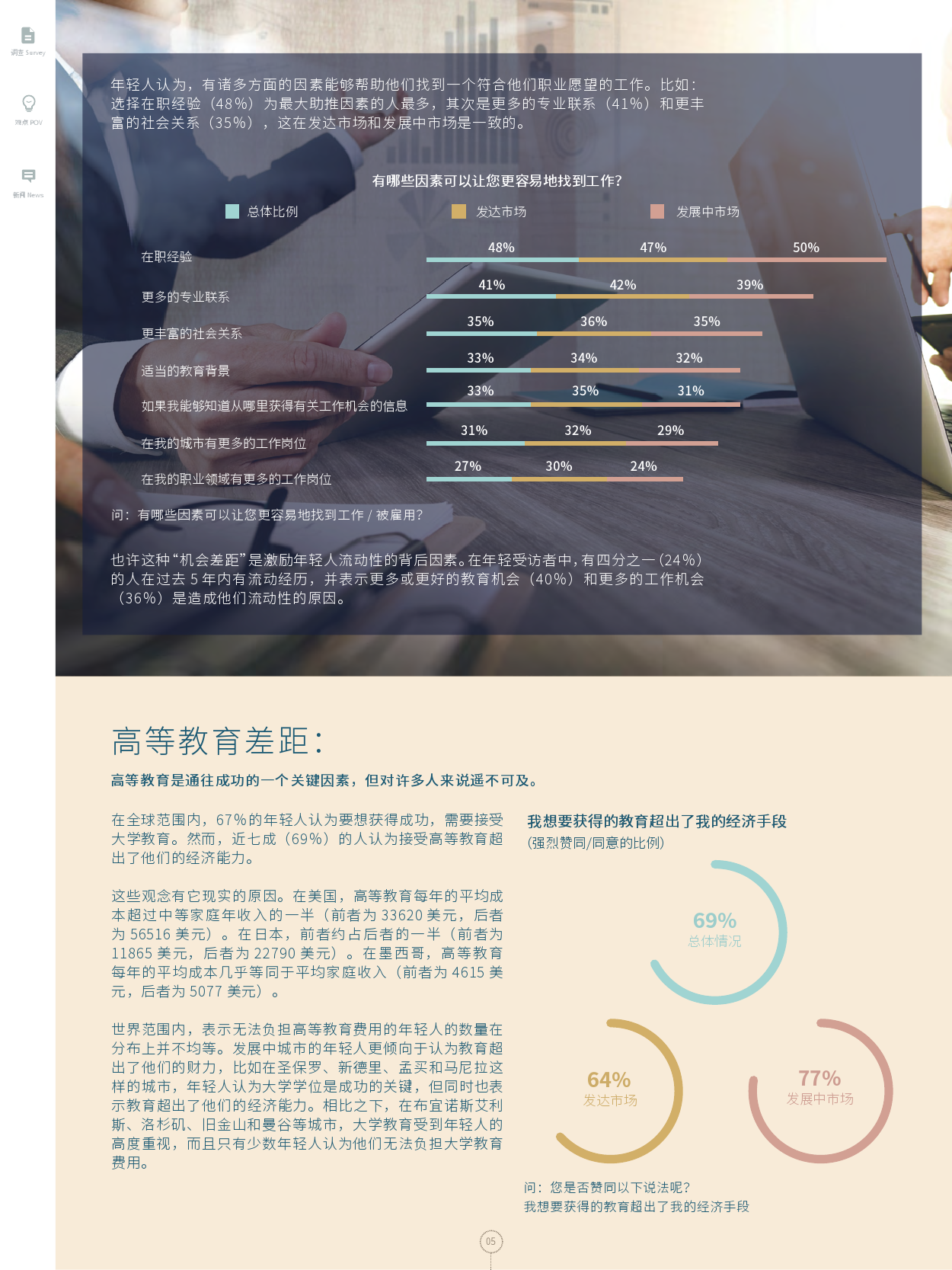 可以看到,对这些年轻人来说,他们仍然会在追求教育和体面工作时遇到巨大障碍,而他们追求的这些工作不仅给他们自己、也给他们的家庭和社区带来经济上的稳定性。虽然大多数年轻受访者对他们的未来表示乐观,但这种乐观主义未必是以他们个人的实际前景为支撑,因为大多数城市的实际收入和经济安全呈下降或停滞趋势。