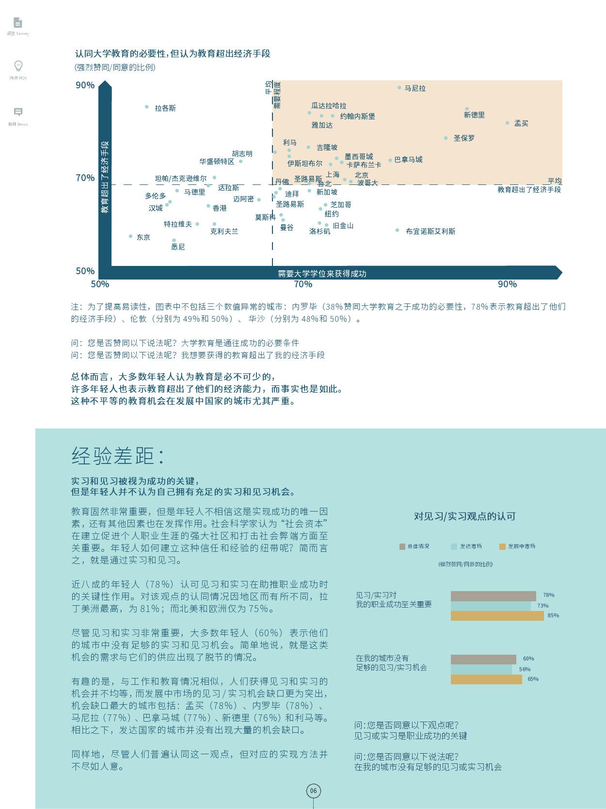 简单地说,就是这类机会的需求与它们的供应出现了脱节的情况。有趣的是,与工作和教育情况相似,人们获得见习和实习的机会并不均等,而发展中市场的见习/ 实习机会缺口更为突出,机会缺口最大的城市包括:孟买(78%)、内罗毕(78%)、马尼拉(77%)、巴拿马城(77%)、新德里(76%)和利马等。相比之下,发达国家的城市并没有出现大量的机会缺口。