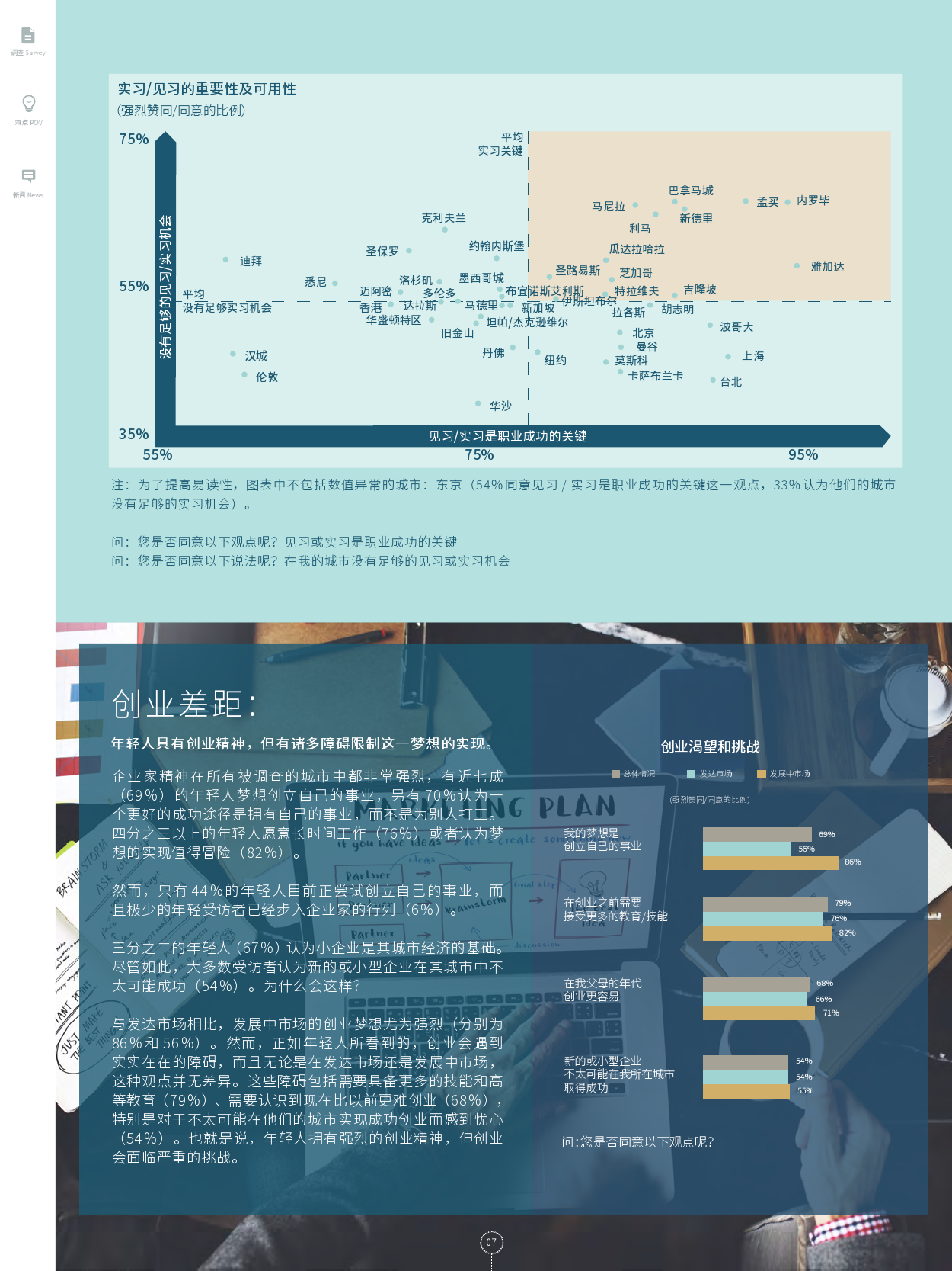 企业家精神在所有被调查的城市中都非常强烈,有近七成(69%)的年轻人梦想创立自己的事业,另有70%认为一个更好的成功途径是拥有自己的事业,而不是为别人打工。四分之三以上的年轻人愿意长时间工作(76%)或者认为梦想的实现值得冒险(82%)。