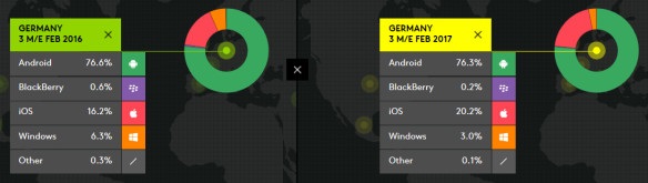 德国市场:Android 保住了自己的市场地位,销售微涨 0.3 个百分点(至 76.3%);iOS 提升了 4 个百分点(至 20.2%);Windows Phone 则从 6.3% 腰斩至 3% 。