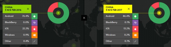 中国市场:Android 从 76.4 % 暴涨至 86.4%(+10%);iOS 却从 22.2% 下滑至 13.2%(-9%);Windows Phone 从 0.9% 跌到快消失的 0.2% 。