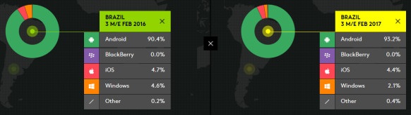 巴西市场:Android 从 90.4% 继续强势增长至 93.2%;iOS 从 4.7% 微降至 4.4%;Windows Phone 从 4.6% 斩半至 2.1% 。