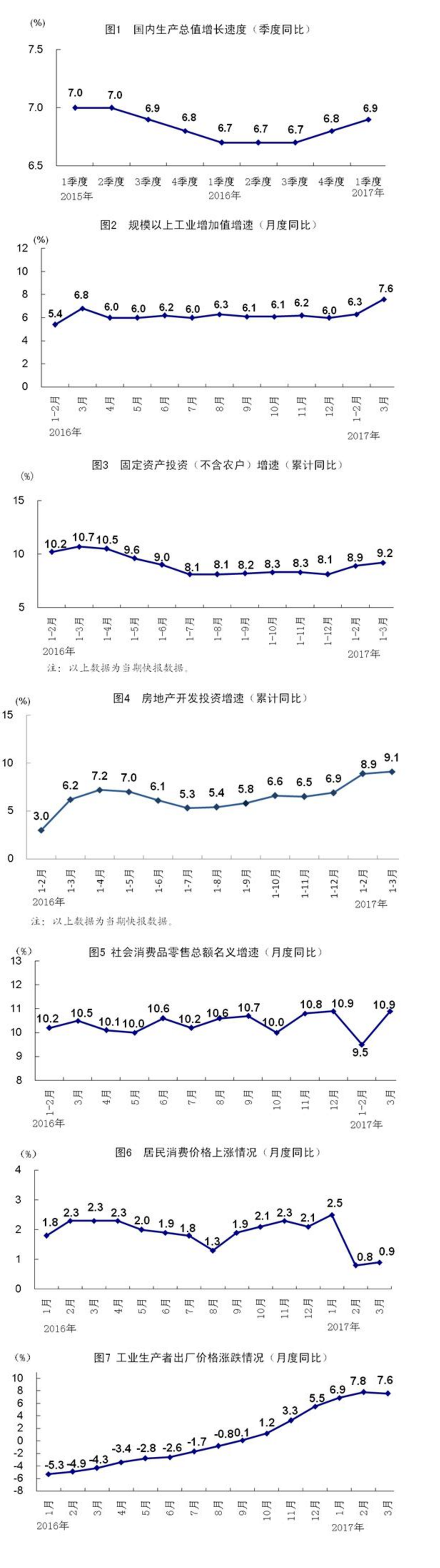 总的来看,一季度国民经济保持了稳中向好发展势头,经济增速略有回升,结构调整持续推进,创新发展步伐加快,民生改善扎实有效,积极因素累积增多,经济运行开局良好。但也要看到,国际环境仍然错综复杂,国内结构性矛盾还比较突出,巩固持续向好态势尚需进一步努力。下阶段,要紧密团结在以习近平同志为核心的党中央周围,切实贯彻落实中央经济工作会议精神和政府工作报告部署,坚持稳中求进工作总基调,贯彻落实新发展理念,以推进供给侧结构性改革为主线,适度扩大总需求,有效引导社会预期,深化创新驱动发展,撸起袖子加油干,促进经济持续向好,实现平稳健康发展。