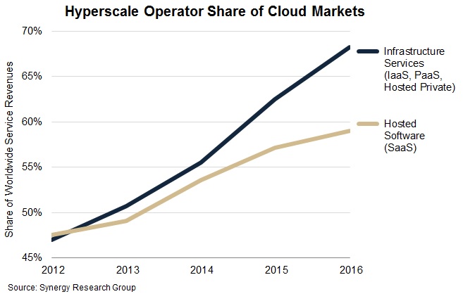 Synergy的追踪了24家超大规模运营商,2016年这些运营商占全球云服务市场的68%,包括IaaS、PaaS和私人托管云服务,占SaaS市场的59%。2012年,这些超大规模运营商仅占云服务市场的47%。超大规模运营商的数据中心通常拥有数十万台服务器,例如亚马逊和谷歌。