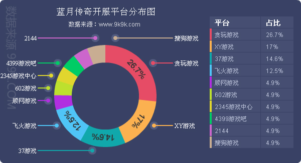 点评:本周《蓝月传奇》开服总数略有减少,多个平台开服频率均保持在2服/天。新增分布占比平台2345游戏中心、2144。