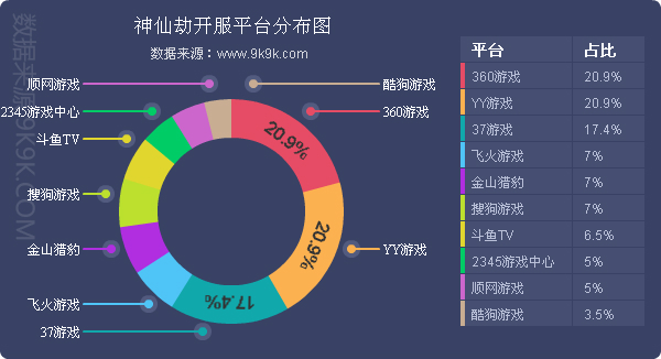 点评:《神仙劫》本周开服略有增涨,YY游戏上调其开服频率为6服/天为主要影响因素,其他平台开服情况未发生明显改变。新增分布占比平台酷狗游戏。