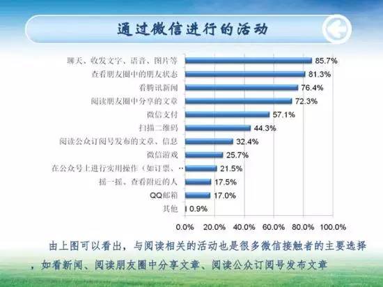 聊天(聊天、收发文字、语音、图片等)、查看朋友圈中的朋友状态这两项活动是成年微信接触者使用微信的主要选择,选择比例分别为85.7%、81.3%,均超过80.0%。而与阅读相关的活动也是很多微信接触者的主要选择,看新闻、阅读朋友圈中分享的文章、阅读公众订阅号发布的文章、信息的选择比例分别为76.4%、72.3%和32.4%。微信的一些实用功能,同样获得了部分微信接触者的青睐。其中微信支付的使用率增长最快,有57.1%的人选择微信支付,较2015年(34.0%)提高了23.1个百分点。在公众号上进行实用操作(如订票、打车、订餐等)、扫描二维码、微信游戏使用率增长也较快,分别为21.5%、44.3%和25.7%,均比2015年(11.3%、34.2%、16.6%)提高了10个百分点左右。