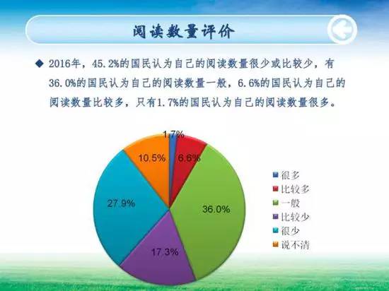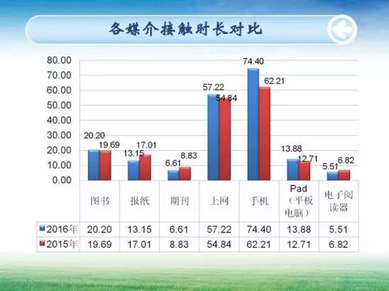 数据显示,2016年我国国民人均图书阅读量为7.86本,较2015年增加了0.02本。人均每天微信阅读时长为26.00分钟,较2015年增加了3.37分钟。数字化阅读的发展,提升了国民综合阅读率和数字化阅读方式接触率,整体阅读人群持续增加,但也带来了图书阅读率增长放缓的新趋势。