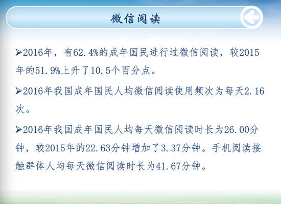 对微信使用情况的考察发现,有62.4%的成年国民在2016年进行过微信阅读,较2015年的51.9%上升了10.5个百分点。