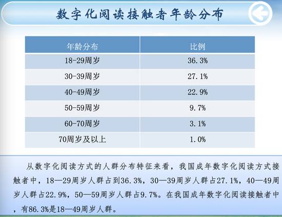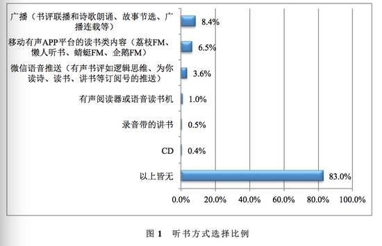 有8.4%的国民接触过广播(书评联播和诗歌朗诵、故事节选、广播连载等),6.5%的国民接触过移动有声APP平台的读书类内容,3.6%的国民收听过微信语音推送的内容,1.0%的国民使用有声阅读器或语音读书机。