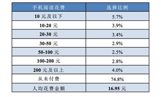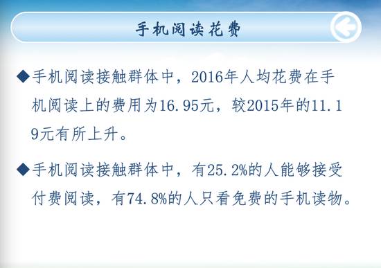 就手机阅读花费来看,手机阅读接触群体中有25.2%的人能够接受付费阅读。2016年,手机阅读接触群体人均花费在手机阅读上的费用为16.95元,较2015年的11.19元有所上升。