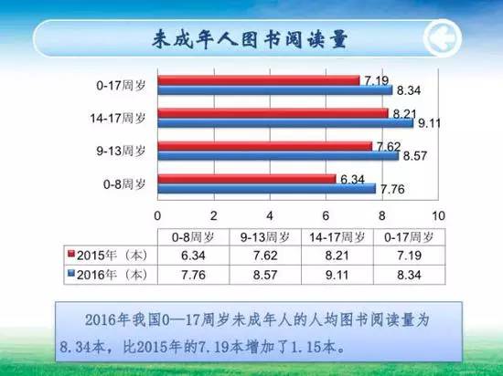 (八)0—17周岁未成年人图书阅读率为85.0%,较2015年提升了3.9个百分点,未成年人的人均图书阅读量为8.34本,较2015年增加了1.15本。