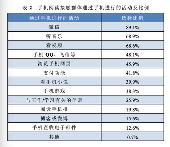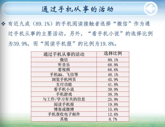 本次调查数据显示,接近四成(39.9%)的成年手机阅读接触者会使用手机看小说。具体来看,有接近九成(89.1%)的手机阅读接触者选择将“微信”作为通过手机进行的主要活动,68.9%的人选择“听音乐”,有68.6%的人选择“看视频”,有48.1%的人选择使用“手机QQ、飞信等”,有45.9%的人选择“浏览手机网页”,有41.8%的人选择手机“支付功能”。此外,有19.8%的人选择“阅读手机报”。具体如下表所示。