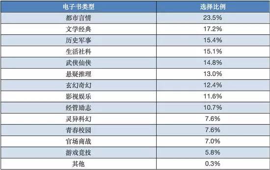 在手机阅读接触群体中,最受欢迎的电子书类型为“都市言情”,其次为“文学经典”。选择都市言情类电子书的比例为23.5%,选择文学经典类电子书的比例为17.2%。