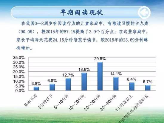 (九)在0—8周岁有阅读行为的儿童家庭中,平时有陪孩子读书习惯的家庭占到90.0%,这些家庭中家长平均每天花24.15分钟陪孩子读书。