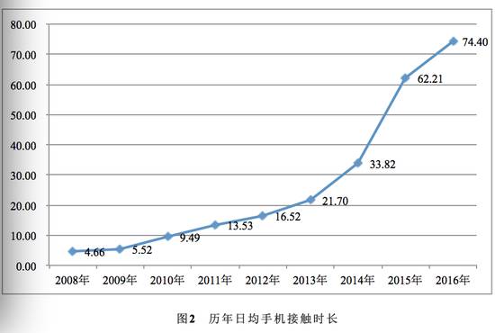 我国成年国民日均手机接触时长连续八年增长,2016年达74.40分钟