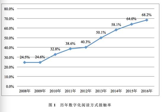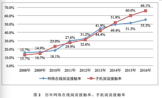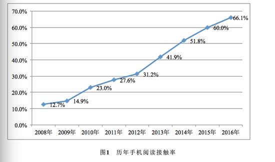 成年国民手机阅读接触率连续八年增长,2016年达到66.1%