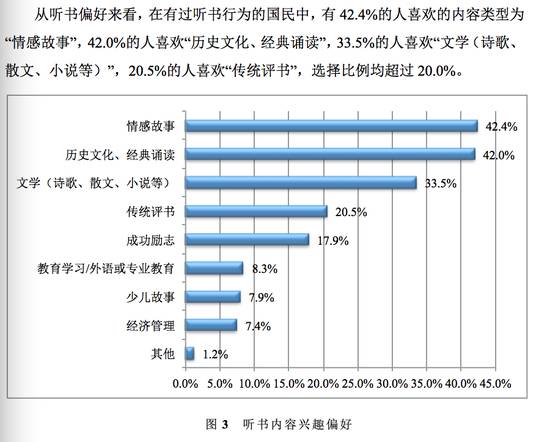 从听书偏好来看,在有过听书行为的国民中,有42.4%的人喜欢的内容类型为“情感故事”,42.0%的人喜欢“历史文化、经典诵读”,33.5%的人喜欢“文学(诗歌、散文、小说等)”,20.5%的人喜欢“传统评书”,选择比例均超过20.0%。