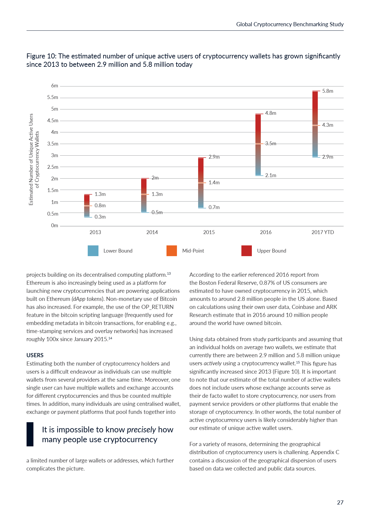 “我们收集的数据显示,数字加密货币的活跃用户人数远远超过许多人从前的认知。许多研究员先前认为加密货币的活跃用户不足100万,但我们的数据显示现在这个数字很可能远远超过100万。”