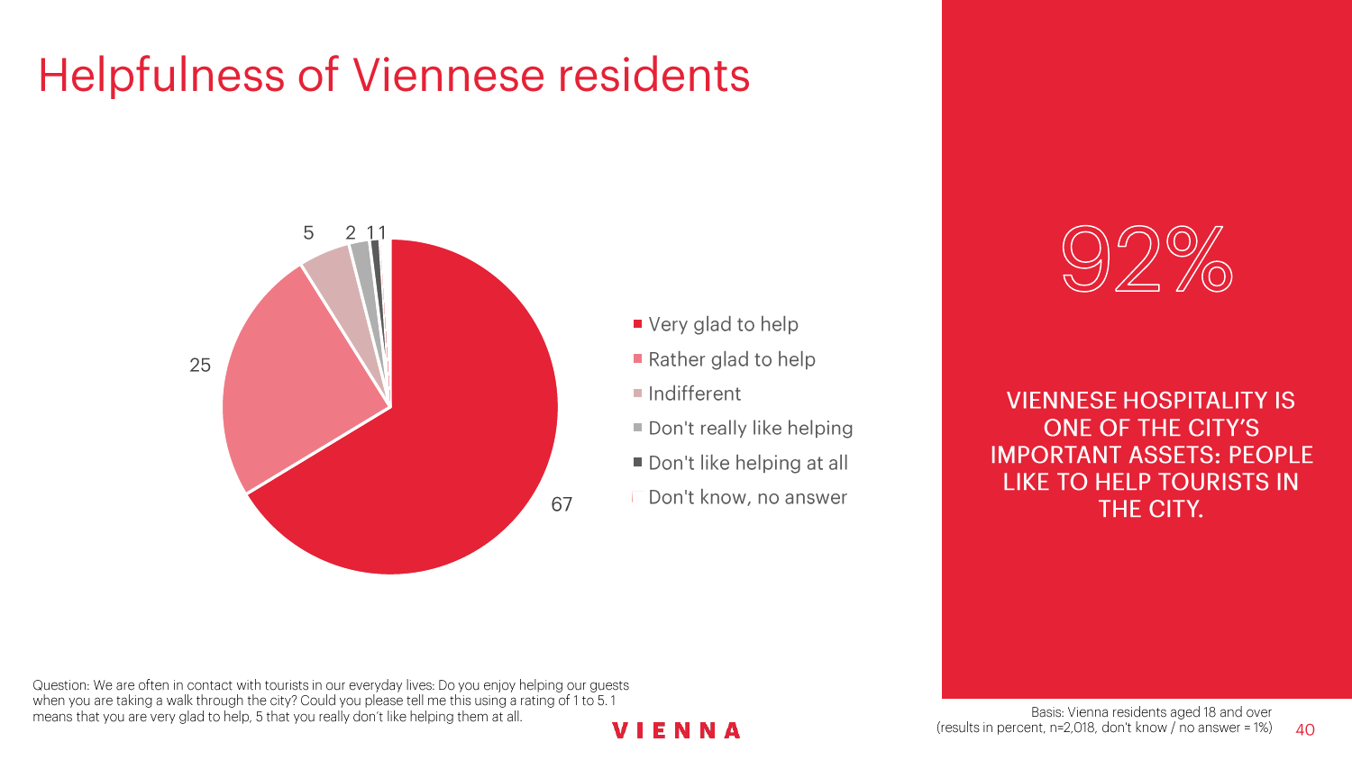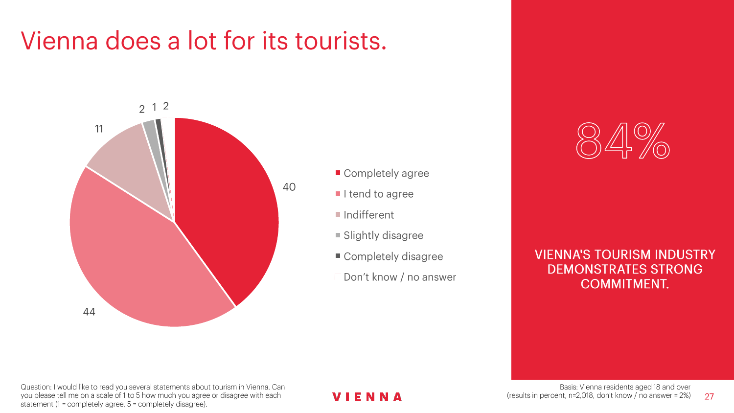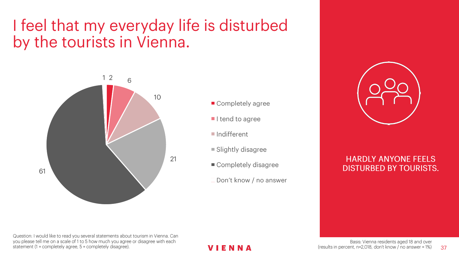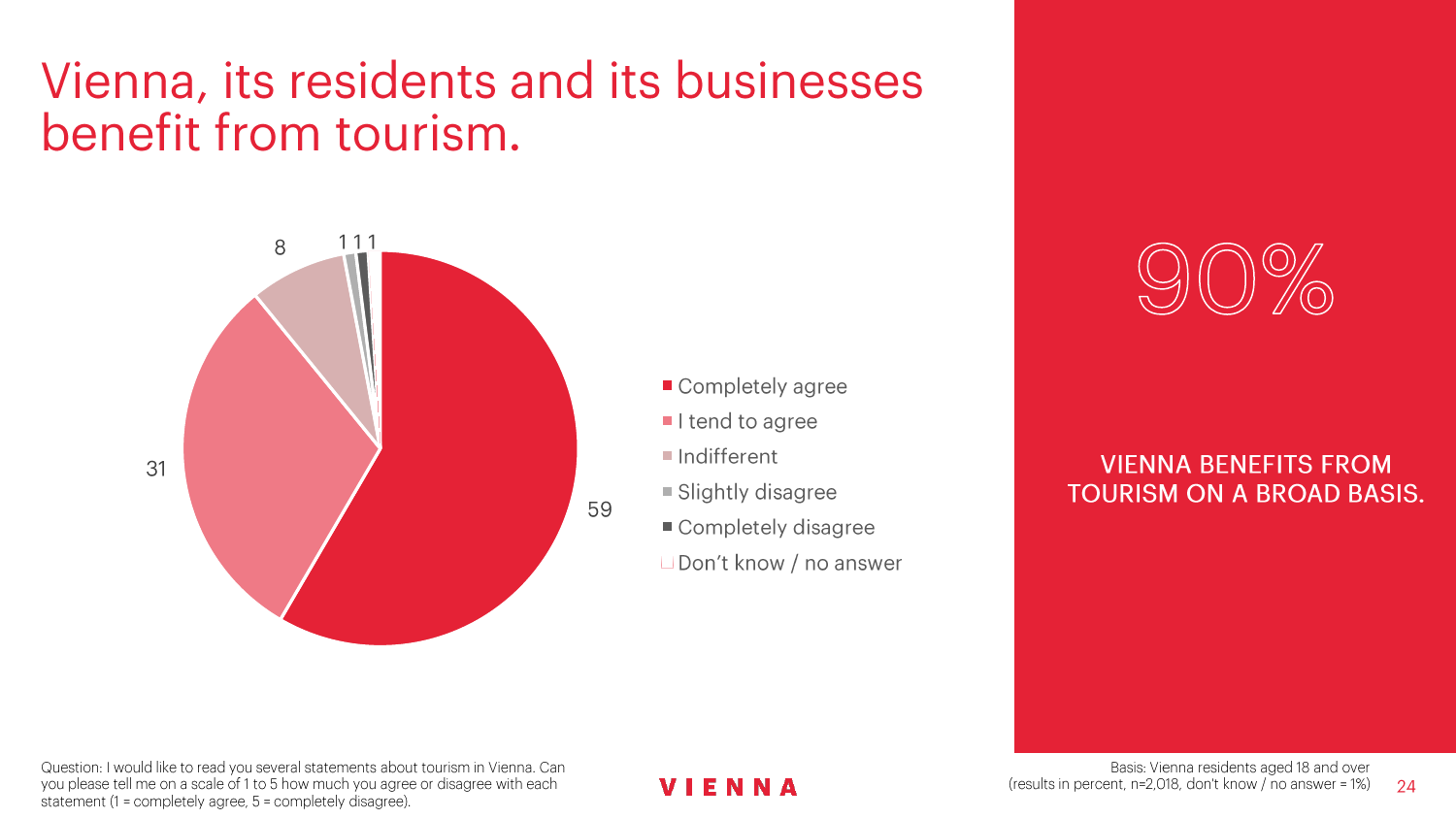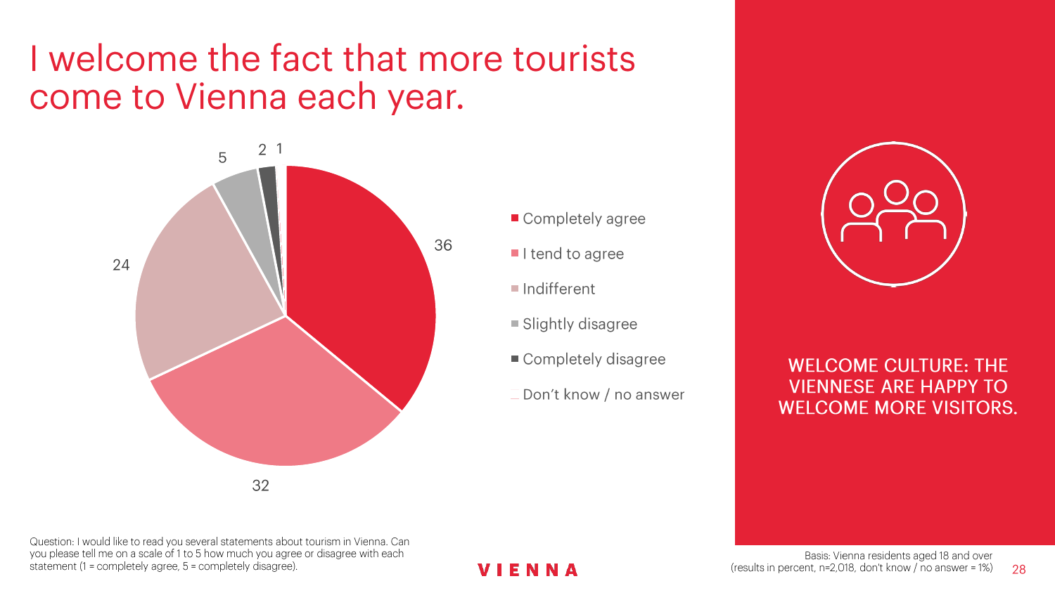 90%的维也纳人都认为,维也纳这座城市及其居民和企业都受益于旅游业。88%的受访者更是指出交易会和大型会议乃是维也纳旅游业的关键成功因素。在回答日常生活是否为游客所打扰这一问题时,82%的受访者给出了否定的答案。绝大多数(89%)受访者都确定旅游业是维也纳的重要经济因素。维也纳人现在还没有把将私人公寓租给游客视为严重问题;59%的受访者表示,出租其住宅附近的私人公寓没有对他们带来困扰,不过将其视为问题的受访者的比例也达到了15%。维也纳旅游局局长诺伯特-克特勒(Norbert Kettner)表示:“维也纳市政府就住宿提供者的权利和义务,以及房东和网络平台需要承担登记地址与详细联系方式方面的法律义务,开展了信息宣传活动,这颇有先见之明。”